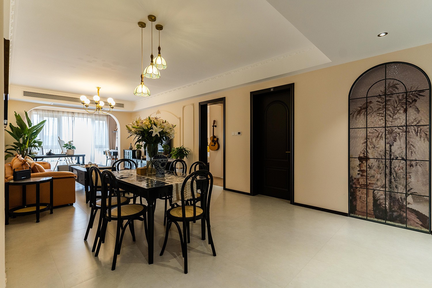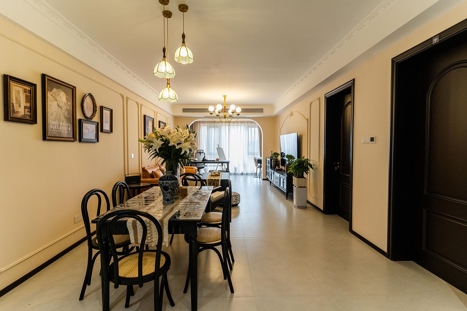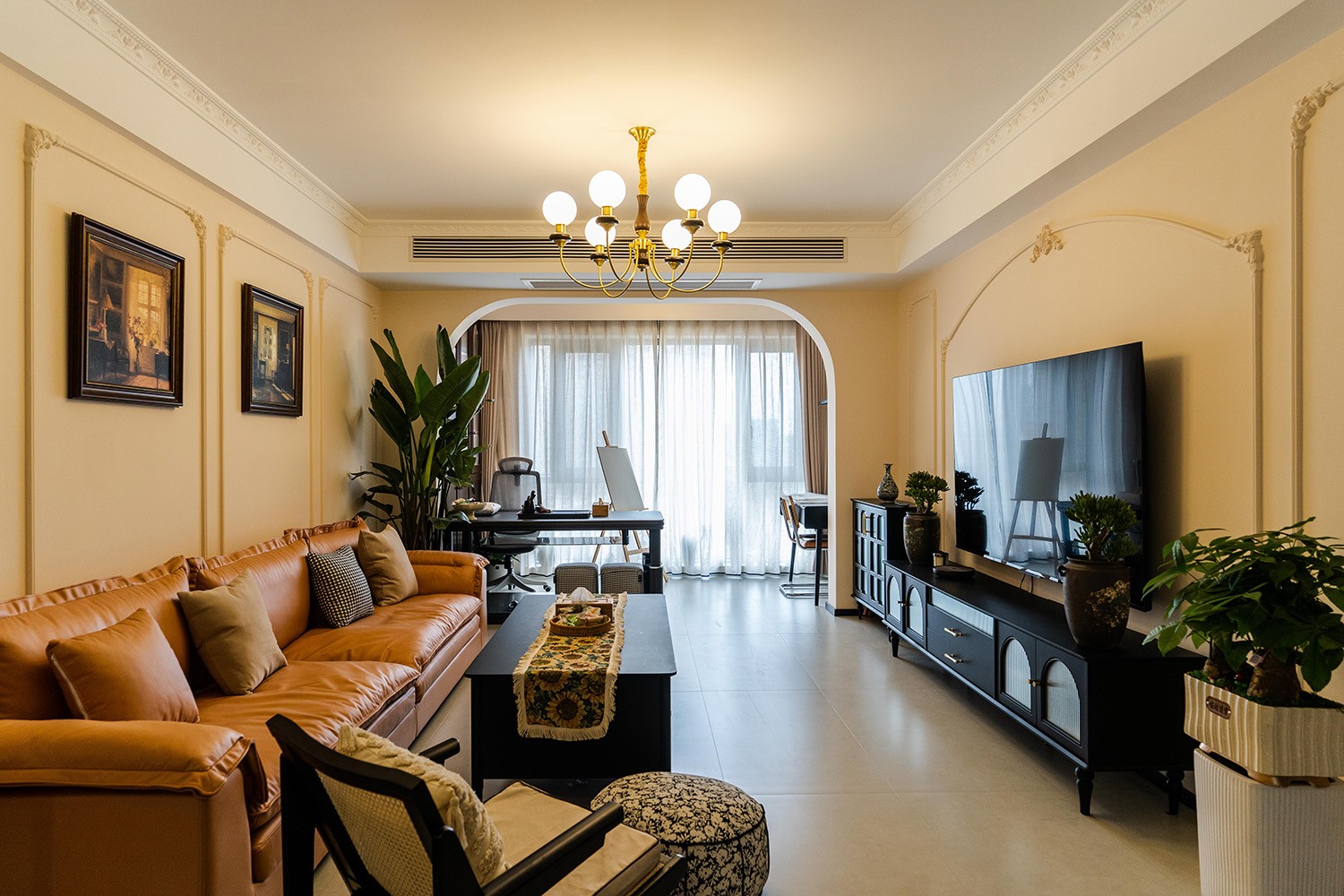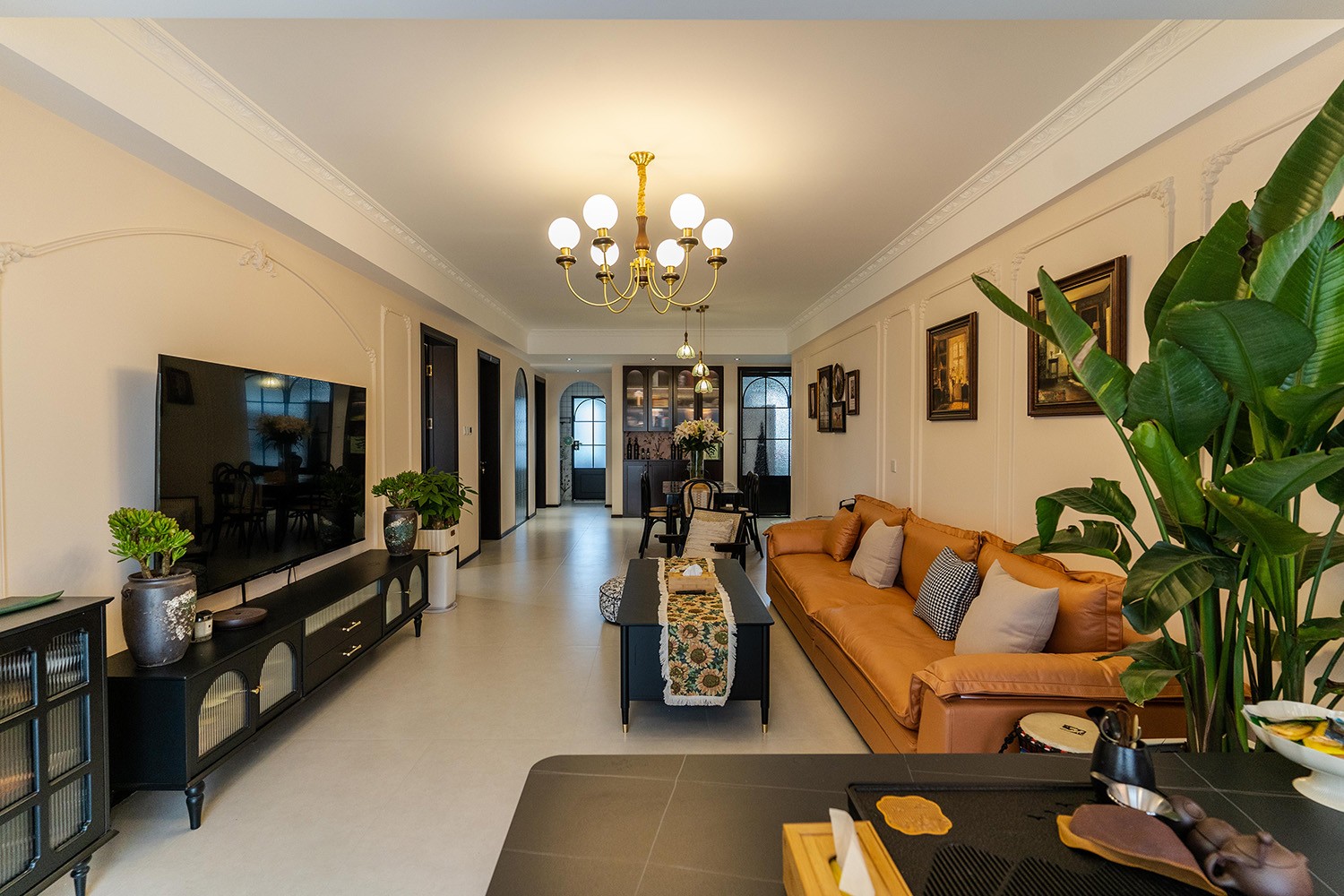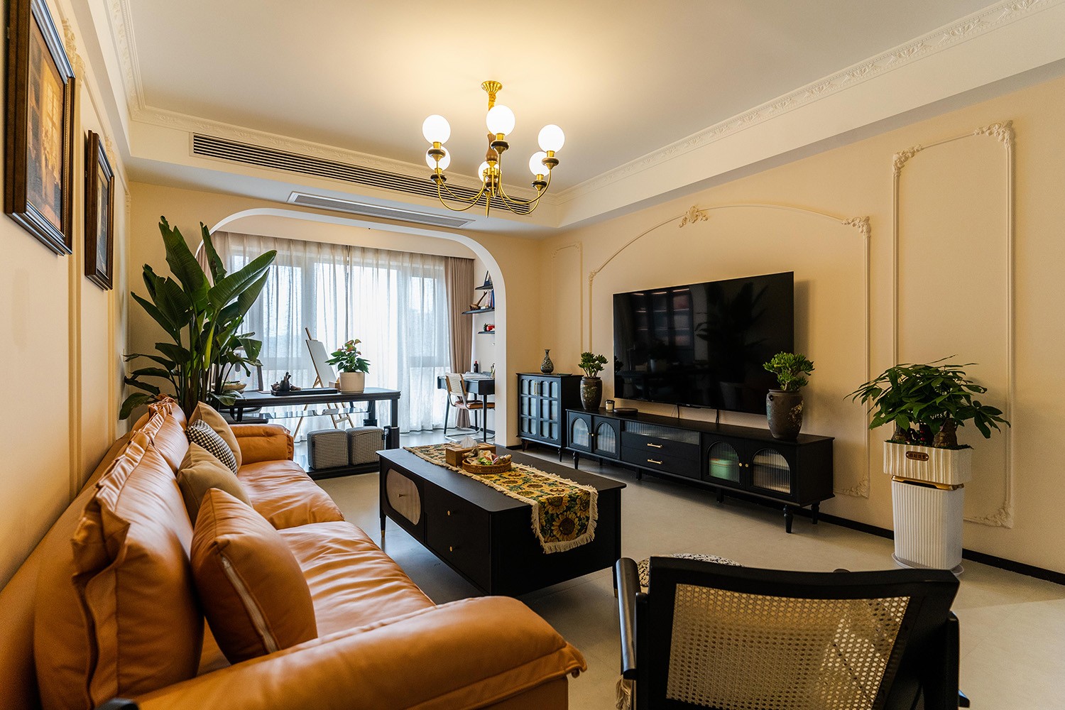 法式復(fù)古風(fēng)格在山水文園113㎡的空間中,通過對色彩、材質(zhì)、光影和造型的精準(zhǔn)把握,打造出一個既有歷史沉淀又符合當(dāng)代審美的理想居所。 軟糯的黑色沙發(fā),色彩與綠植形成呼應(yīng),與陽臺圍合成一處溫馨的生態(tài)空間。在快節(jié)奏、高強度的工作之余,為疲憊的身軀找到安放之處。復(fù)古的色調(diào),仿佛是歲月沉淀的詩篇;細膩的紋理,講述著往昔的故事。吊燈投射出溫暖而柔和的光,照亮了角落里被遺忘的時光。 這不僅僅是一種設(shè)計風(fēng)格,更是對生活方式的深度詮釋——在懷舊的底色中,描摹當(dāng)代生活的浪漫想象;在復(fù)古的韻味里,安放現(xiàn)代人的詩意棲居。