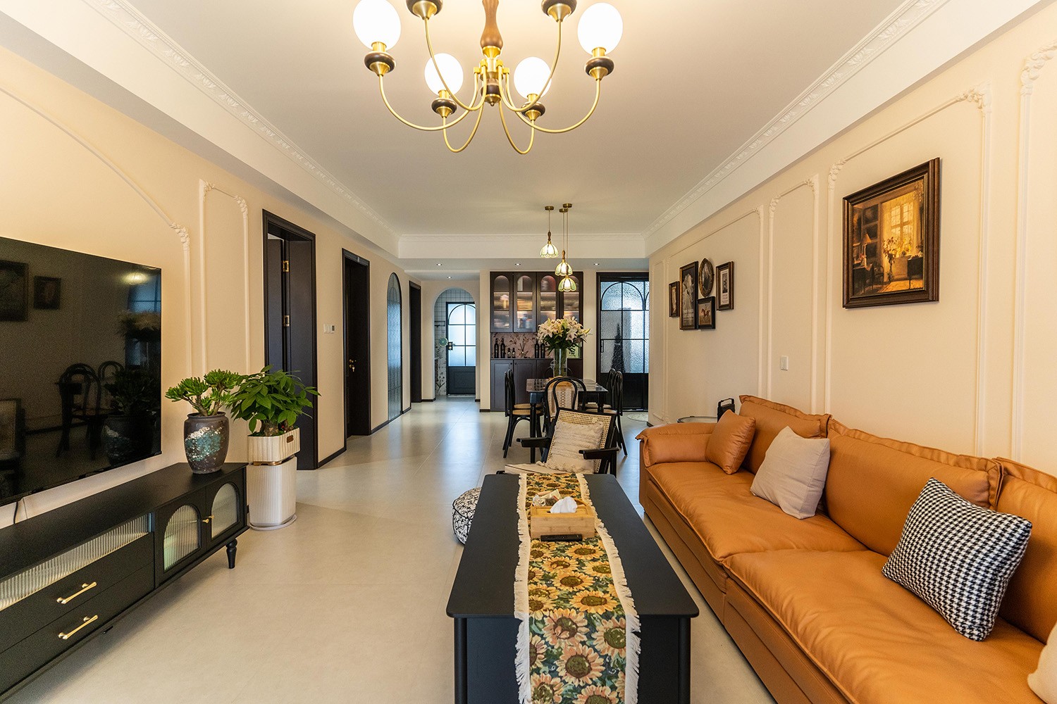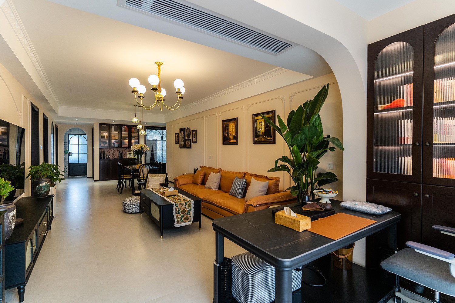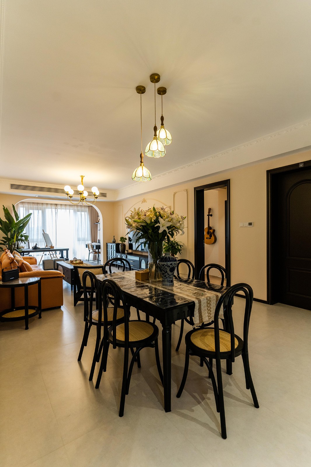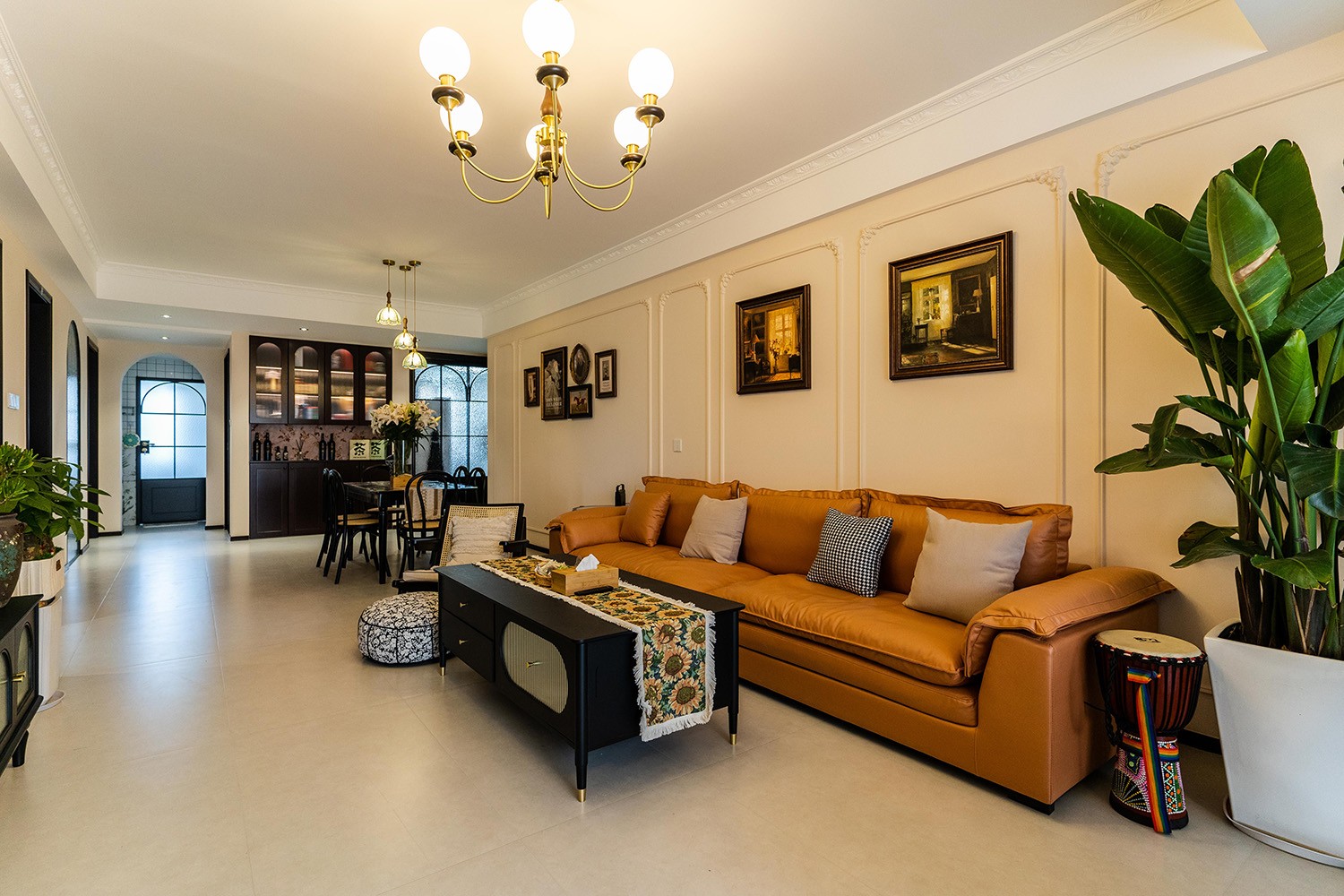 法式復(fù)古風(fēng)格在山水文園113㎡的空間中,通過對色彩、材質(zhì)、光影和造型的精準(zhǔn)把握,打造出一個既有歷史沉淀又符合當(dāng)代審美的理想居所。 軟糯的黑色沙發(fā),色彩與綠植形成呼應(yīng),與陽臺圍合成一處溫馨的生態(tài)空間。在快節(jié)奏、高強度的工作之余,為疲憊的身軀找到安放之處。復(fù)古的色調(diào),仿佛是歲月沉淀的詩篇;細膩的紋理,講述著往昔的故事。吊燈投射出溫暖而柔和的光,照亮了角落里被遺忘的時光。 這不僅僅是一種設(shè)計風(fēng)格,更是對生活方式的深度詮釋——在懷舊的底色中,描摹當(dāng)代生活的浪漫想象;在復(fù)古的韻味里,安放現(xiàn)代人的詩意棲居。