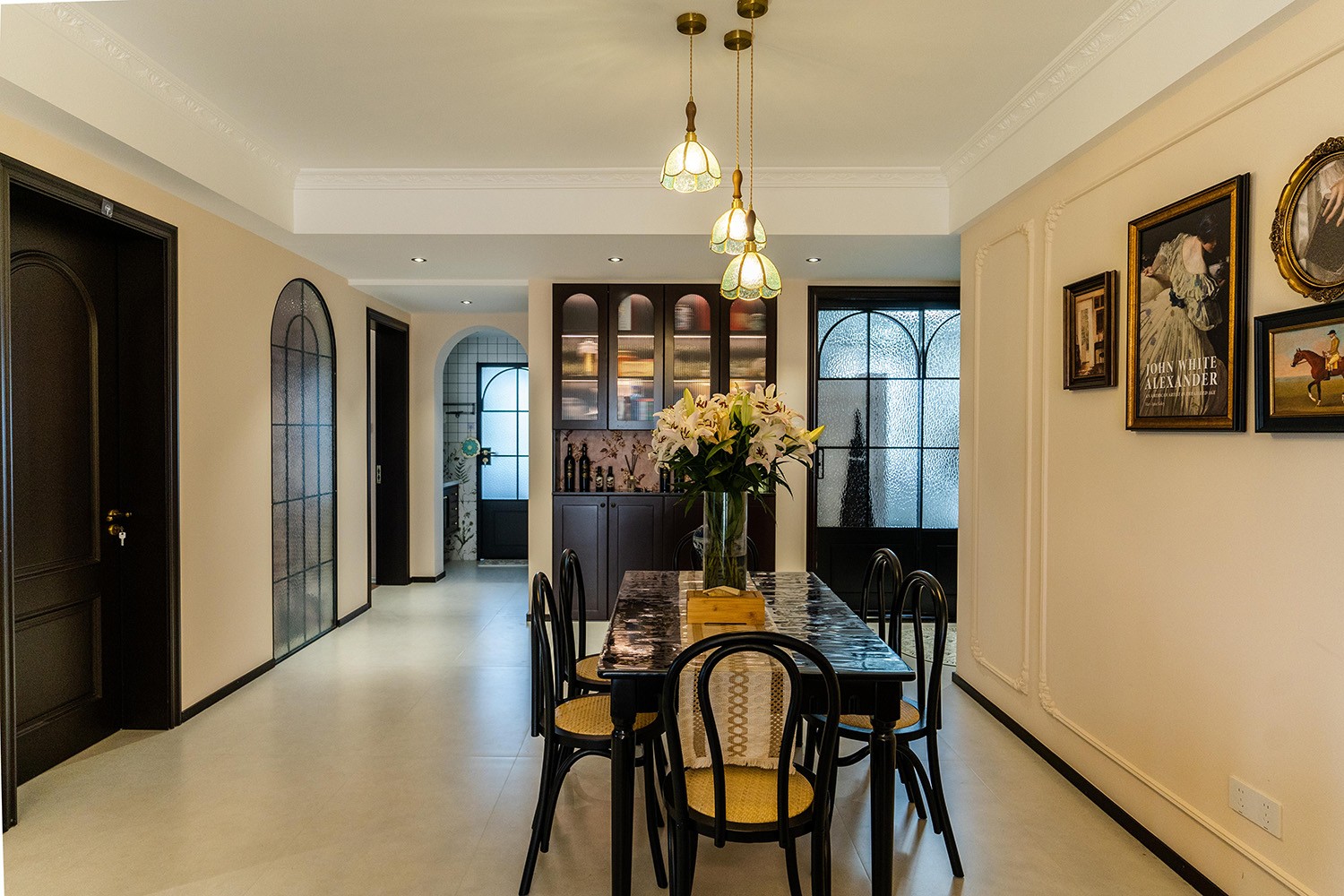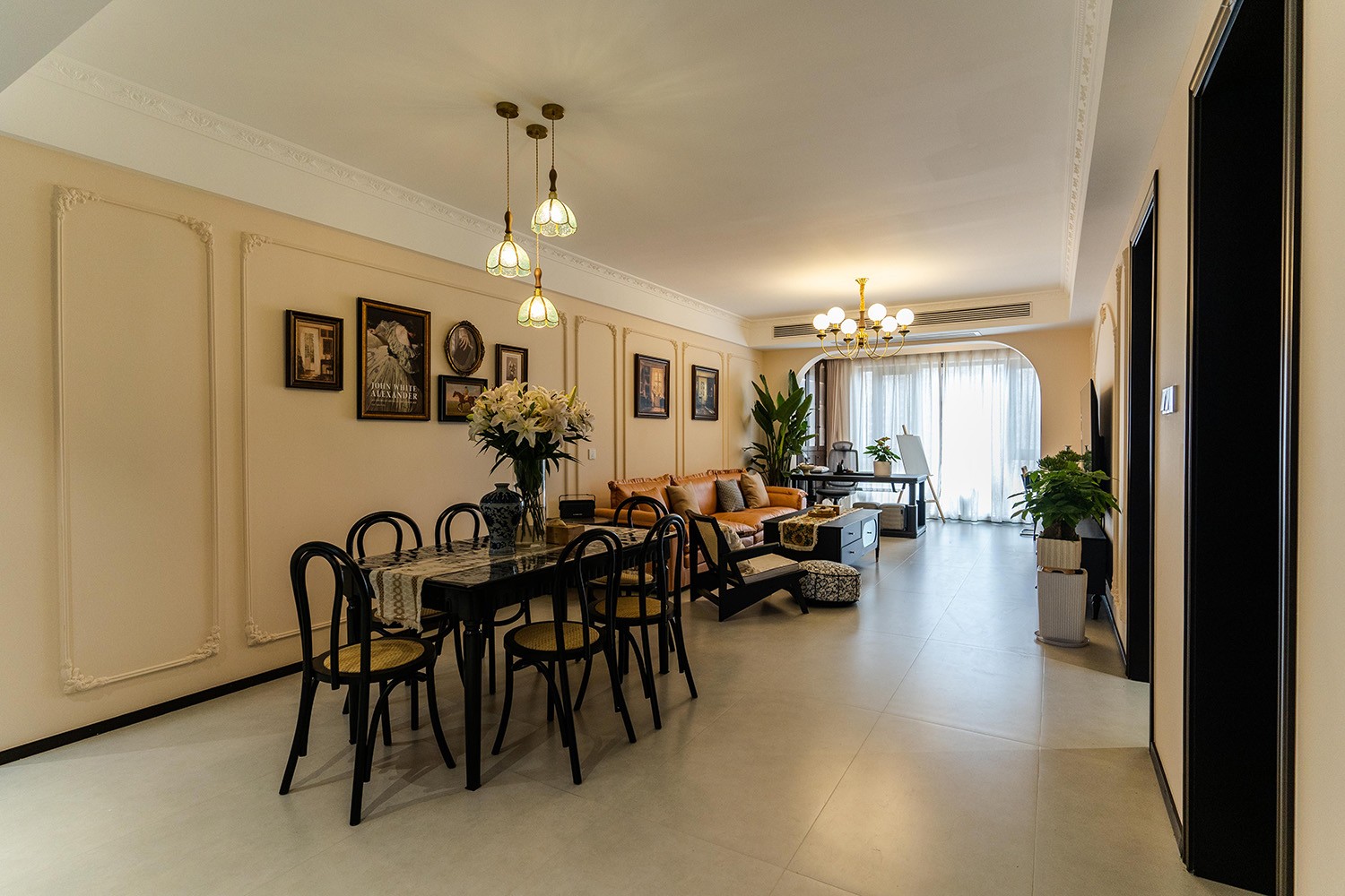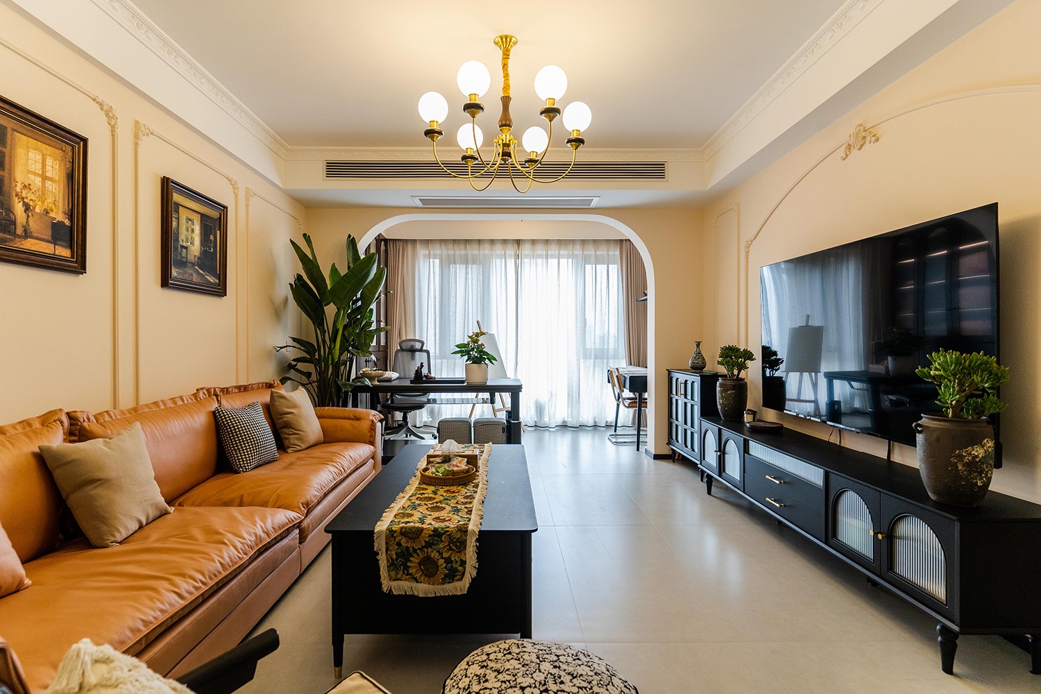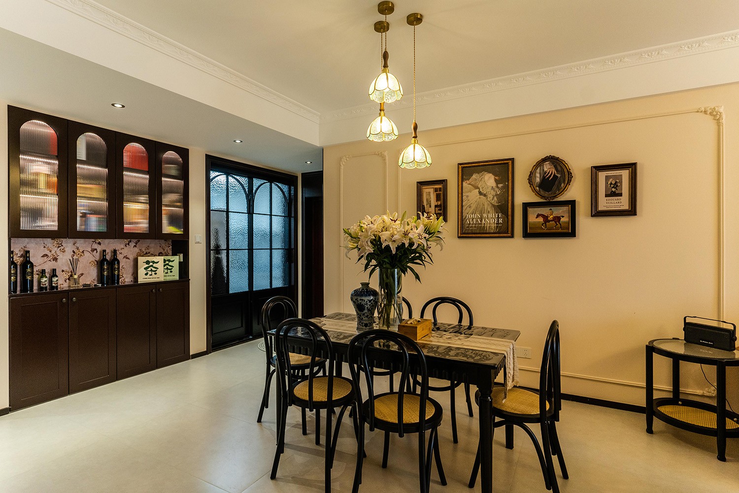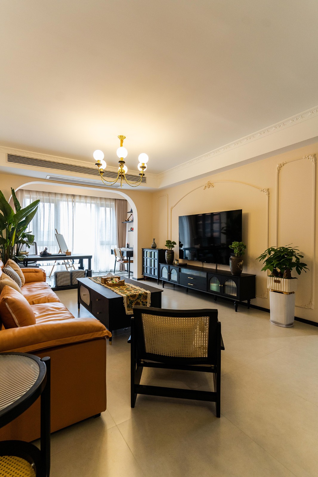 法式復(fù)古風(fēng)格在山水文園113㎡的空間中,通過對色彩、材質(zhì)、光影和造型的精準(zhǔn)把握,打造出一個既有歷史沉淀又符合當(dāng)代審美的理想居所。 軟糯的黑色沙發(fā),色彩與綠植形成呼應(yīng),與陽臺圍合成一處溫馨的生態(tài)空間。在快節(jié)奏、高強度的工作之余,為疲憊的身軀找到安放之處。復(fù)古的色調(diào),仿佛是歲月沉淀的詩篇;細膩的紋理,講述著往昔的故事。吊燈投射出溫暖而柔和的光,照亮了角落里被遺忘的時光。 這不僅僅是一種設(shè)計風(fēng)格,更是對生活方式的深度詮釋——在懷舊的底色中,描摹當(dāng)代生活的浪漫想象;在復(fù)古的韻味里,安放現(xiàn)代人的詩意棲居。